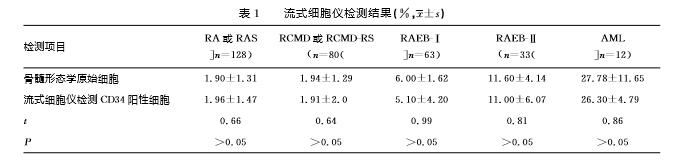 2.4 流式细胞仪检测结果 在MDS各亚型中CD34阳性细胞与骨髓形态学原始细胞数比较差异无统计学意义(P>0.05),见表1。