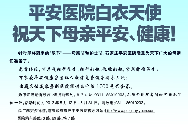 针对即将到来的“双节”--母亲节和护士节,石家庄平安医院隆重为天下广大的母亲们准备了: