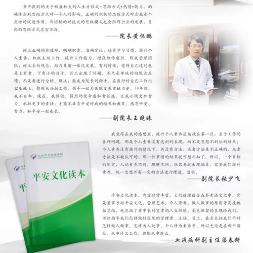 “服务是没有止境的,满意只是相对的,这就要求我们医务工作者,要根据服务对象的不同,了解他们的心理,不断改进、提高我们的服务水平,在他们需要之前就能给予相应的服务。”这是平安集团董事长牛景月在“平安文化读本”中提炼的大服务观。